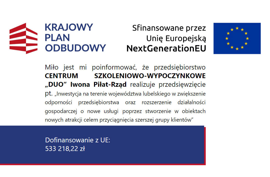 Aby świadczyć usługi na najwyższym poziomie, Serwis wykorzystuje pliki cookies zapisywane w pamięci przeglądarki. Szczegółowe informacje na temat celu ich używania, w tym przetwarzania danych dotyczących aktywności użytkownika oraz personalizacji reklam, oraz możliwość zmian ustawień plików cookies, znajdują się w Polityce prywatności. Klikając AKCEPTUJĘ WSZYSTKIE, wyrażasz zgodę na korzystanie z technologii takich jak cookies i na przetwarzanie przez Centrum Szkoleniowo Wypoczynkowe Iwona Piłat-Rząd, Turystyczna 10A, 23-300, Janów Lubelski Twoich danych osobowych zbieranych w Internecie, takich jak adresy IP i identyfikatory plików cookie, w celach analitycznych i marketingowych (w tym do zautomatyzowanego dopasowania reklam do Twoich zainteresowań, mierzenia ich skuteczności oraz przetwarzania danych użytkownika dla celów analitycznych). Zmiany ustawień plików cookies oraz szczegółowe preferencje dotyczące zgód możesz dokonać w .